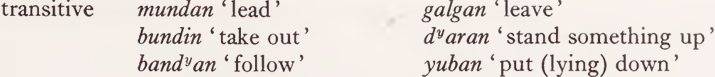 we see that we have the (non-causative) transitive verbalizer -(m)ban, plus bawal, for mundan, as against intransitive verbalizer -bin plus bawal for yanu. This would suggest that yanu and mundan have the same semantic content, and differ only in that mundan belongs to the class of transitive verbs and yanu to that of intransitive verbs.