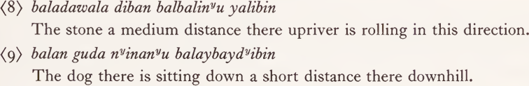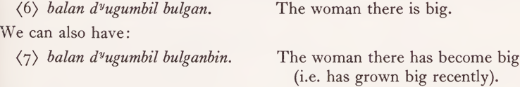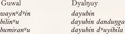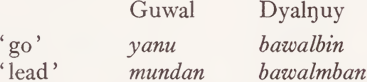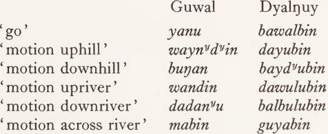From our assumption that a one-to-one Guwal-Dyalŋuy correspondence implies a relation of synonymy between the words concerned, and the fact that verbalizer -bin does not change the semantic content of a word, but just marks it as an intransitive verbal, it follows that the semantic content of waynydyin must be the same as that of dayu, and so on. (That is, leaving aside the feature ‘ long way ’ in the semantic description of dayu; verbs of motion do not specify distance and in fact Dyalŋuy correspondents involve the unmarked feature from the system {long, medium, short distance}.)