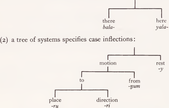 where X1 refers to climbing a tree with a gamin, X2 to climbing a tree (without a gamin) and X3 is the unmarked feature; in fact, waynydyin can either have a generic meaning, including the particular meanings of bilinyu and bumiranyu, or else a more specific meaning, complementary to those of the other two words (‘ climb something other than a tree, e.g. a hill, steep bank or cliff’). However, X1 X2 and X3 would be entirely ad hoc: these features would not recur in the semantic descriptions of any other words. We would not be providing any semantic insight by setting up a three-feature system merely semantically to distinguish three words. And in fact yugu and gamin are ‘ nuclear ’ nouns, dealt with by the semantic description of the class of nouns; dyuyi and dandu are in normal syntactic relations with dayubin in the Dyalŋuy correspondents. We can thus take waynydyin as a nuclear verb, with semantic description (position, motion, not water, up; intransitive) and bilinyu and bumiranyu as non-nuclear verbs, semantically defined in terms of the semantic descriptions of waynydyin and of two nouns, through established grammatical relations. There is no need to set up the ad hoc system {X1, X2, X3}. (However, we cannot dispense with any of the features in the tree on page 447; waynydyin, mabin, etc. can not be defined in terms of any other words; and in any case these features do occur both in the semantic descriptions of a number of lexical words, and within the grammar.).