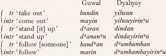 Dyirbal verbs are very strictly categorized as transitive or intransitive; there are a number of pairs of verbs that appear to have the same or almost the same semantic content and to differ only in transitivity, but (with one exception: ŋabanyu ‘ bathe ’; ŋaban ‘ immerse in water ’) the members of such pairs are non-cognate. In almost all these cases there is a single transitive verb in Dyalŋuy; the reflexive form of this verb is given as Dyalŋuy correspondent of the intransitive member of the Guwal pair.5 For instance: