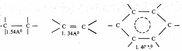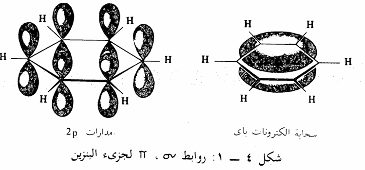 المدارات الجزيئية: المدارات الجزئية لجزىء البنزين تعطي صورة أوضح للرابطة المضاعفة في جزىء البنزين. نجد أن ذرات حلقة البنزين تقع في مستوى واحد وأنها مرتبطة مع بعضها على هيئة مسدس متساوي الأضلاع (زوايا 120) بها كل الروابط الست بين ذرات الكربون بنفس الطول (1,40 أنجستروم) وكل ذرة كربون مرتبطة بذرة هيدروجين، ولمثل هذا النوع من الروابط كل ذرة كربون يكون لديها مدارات من نوع sp2 ذرات الكربون الست مرتبطة مع بعضها البعض بشكل سداسي بروابط أحادية تتكون بتداخل مدارات من نوع 2sp وكل ذرة كربون مرتبطة بذرة هيدروجين برابطة سيجما Sigma bond ناتجة من التداخل بين مدارات 1s و sp2 بالإضافة إلى ذلك كل ذرة كربون تحتوي على مدار 2p يحتوي على الكترون واحد التداخل بين مدارات 2p السته يكون ثلاث روابط بای وبسبب تماثل الجزىء، فإن كلا من مدارات 2p يمكن أن يكون رابطة مع أى مدارات p2 في ذرتي الكربون المتجاورتين، أي أن مدارات باى تكون لا موضعية وبالتالي فإن كثافة الكترونات بای π -electrons تكون تماماً متماثلة حول حلقة البنزين مكونة سحابة الكترونية تمتد فوق وأسفل الحلقة وتؤدي إلى ثبات الجزىء واستقرار الحلقة، وبناء على ذلك. فإن الروابط بين ذرات الكربون لا تأخذ أبعاد أطوال الرابطة الأحادية أو الثنائية وإنما تكون أبعاد أطوال وسطية بين القيمة التي تخص الرابطة الأحادية والثنائية كما سبق وأن أوردنا والشكل 4 - 1 يوضح مدارات 2p وسحابة الكترونات باي الحلقة البنزين
