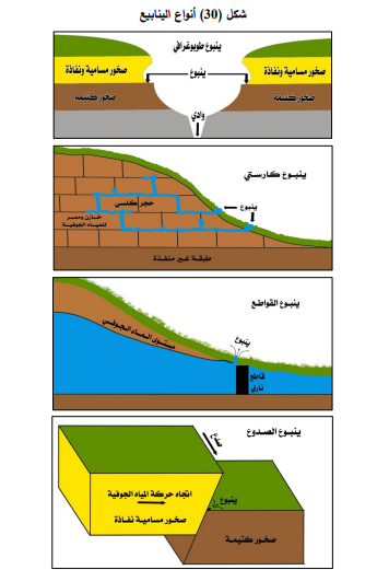 تتباين مظاهر المياه الجوفية تبعاً لطريقة ظهورها على السطح إلى: