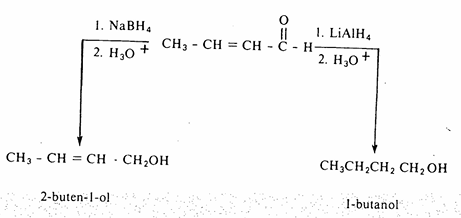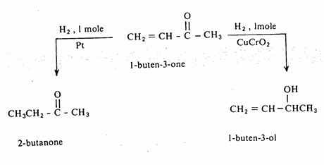 الاختزال: سبق وأن أشرنا أن الألدهيدات والكيتونات يمكن اختزالها إلى (ب) الكحولات الأولية والثانوية على التوالي. وقد يتم الاختزال بوساطة الهيدروجين في وجود عامل مساعد البلاتين) أو البلاديوم أو النيكل أو بوساطة مواد كيميائية مختزلة مثل 4LiAIH للعامل المساعد أهميته في عملية الاختزال فإنه بالإمكان اختزال نوع معين من الروابط دون تأثر النوع الآخر عند وجود النوعين القابلة للاختزال معاً في الجزىء وذلك تبعاً لتغير العامل المساعد المستخدم، على سبيل المثال: