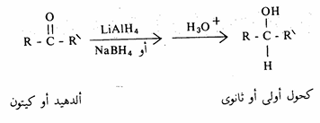 أولاً: تفاعل المركب الكربونيلي مع LiAIH4 وتحت ظروف جافة تماماً - في الغالب يستخدم الايثر أو داي جليم Diglyme .