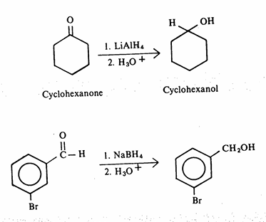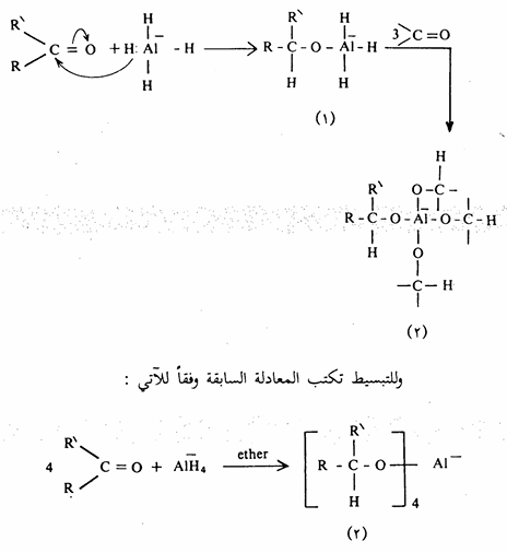 وتمثل كل من مادة LiAIH4 ومادة NaBH4 مصدراً لأيون الهيدريد (H) الذي يهاجم ذرة كربون مجموعة الكربونيل (تفاعل إضافة نيكلوفيلية) لينتج ناتج الإضافة (1) الذي لا يزال في حد ذاته يحوي ثلاث أيونات هيدريد مرتبطة بذرة الألومنيوم وعليه فإن الأمر يحتاج إلى 3 مولات أخرى من المركب الكربونيلي ليتكون ناتج الإضافة (2)، بمعنى آخر تتفاعل أربعة مولات من المركب الكربونيلي مع مول واحد من.LiAlH4