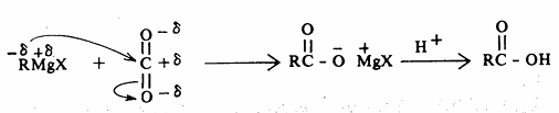 ( أ ) تفاعل كاشف جرينارد مع ثاني أكسيد الكربون يتفاعل كاشف جرينارد مع CO2 ويتكون أيون الكربوكسيليت، ومن ثم الحمض الكربوكسيلي الحر عند معاملة هذا الأيون بحمض معدني وذلك وفقاً للمعادلة العامة التالية: