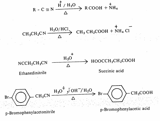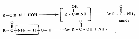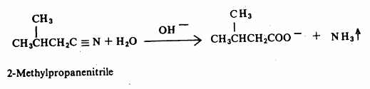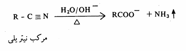 (ب) من النتريلات تتحلل النتريلات مائياً في الأوساط القلوية، إلى الحموض الكربوكسيلية المطابقة كما يتضح من المعادلة التالية: