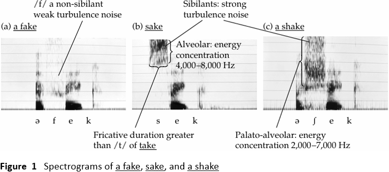 The spectrograms in figure 1 illustrate some of the points made above. Consider the patterns in (a) a fake, (b) sake, and (c) a shake. The difference between (a) and (b) (or (c)) is so obvious that the greater frication noise for sibilants (/s/ or /ʃ/) can be seen effortlessly. When we compare (b) and (c), we observe the frication noise concentrated at different frequencies; approximately 4,000–8,000 Hz for the alveolar /s/, and 2,000–6,000 Hz for the palate-alveolar /ʃ/.