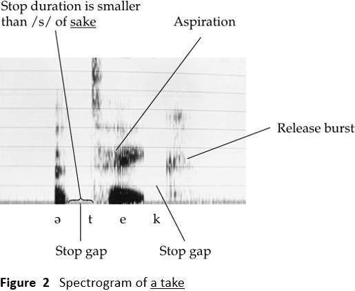 Now, consider the spectrogram for a take (figure 2). This is given to show the durational differences between stops and fricatives. If we compare the duration of /t/ in a take with the duration of /s/ in sake, we can verify the greater duration of fricatives than stops.