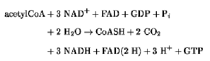 It is estimated that about two thirds of the energy requirements of aerobic cells is met by the complete oxidation of the acetyl group of acetylCoA to CO2 in the TCA cycle (also called the citric acid cycle or the Krebs cycle.) In this cyclical sequence of reactions, acetylCoA condenses with oxaloacetate to form citrate in a reaction catalyzed by the enzyme citrate synthase. Subsequent reactions of the cycle donate electrons to the coenzymes NAD+ and FAD for ATP generation from oxidative phosphorylation, regenerate oxaloacetate, and release two carbons as CO2. The net reaction of the TCA cycle is: