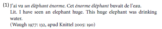 Knittel (2005: §2.2) (following Waugh 1977) noted that adjectives such as magnificent, when postnominal, are used to introduce new information, while their prenominal position indicates that they are part of an anaphoric NP. The following French sentence illustrates this observation:
