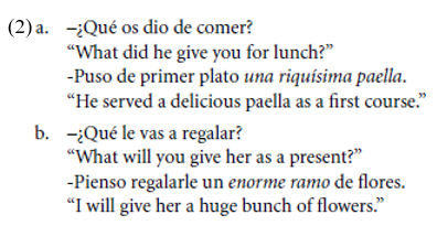 This apparent generalization does not hold in Spanish. The examples in (2) show contexts where new information is introduced when the adjective of subjective evaluation occurs prenominally: