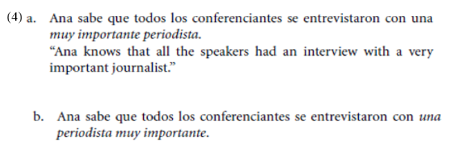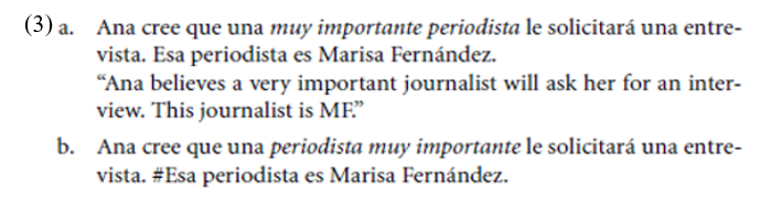 I understand that the contrast in (1) is a subcase of another much noted and important distinction involving prenominal adjectives, namely the fact that, in indefinite contexts, DPs with prenominal adjectives have a specific reading as can be see in (2). On the other hand, DPs with postnominal adjectives are ambiguous between a specific and a non-specific interpretation (Picallo 1994; Bosque 1996; Demonte 1999). Presupposition of existence of the journalist is clear in (3a), which can be continued as indicated; the same continuation is not acceptable in (3b) because the DP with an adjective following N gets a non-specific reading: