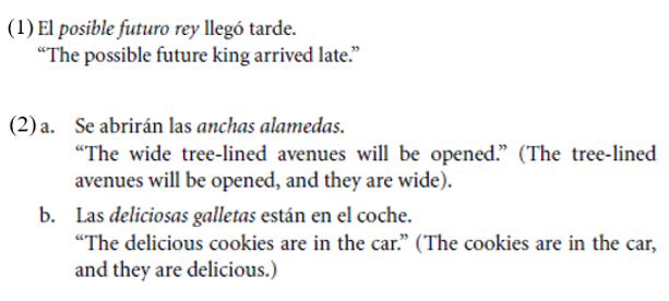 Secondly, we have distinguished two subtypes of [−p] or prenominal adjectives, which give rise to the following readings: (i) modal and event modifier adjectives, with an intentional reading, as in (1) (recall also (ii) qualitative adjectives with a non-restrictive reading, as in (2).
