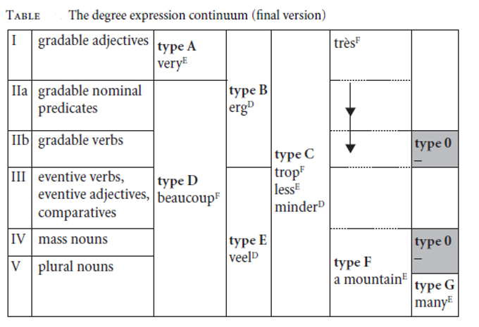 A first, rather naive, hypothesis about the status of adjectives is based on the difference between quantities and qualities. Adjectives denote qualities, and as such adjectival modifiers correspond to intensifiers. One could assume that type A expressions are restricted to adjectives because they fail to indicate a quantity. Verbs and nouns introduce a quantity and combine with expressions that indicate a degree of quantity, while adjectives correspond to qualities and as such are modified by intensifiers: