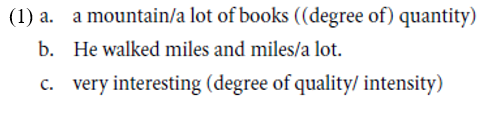 Note that the difference between a quality and a quantity is not always obvious. Gradable abstract nouns such as success and patience behave like mass nouns (much success, a lot of patience) with respect to the degree expressions they combine with. However, intuitively, these nouns correspond to a scale that is qualitative rather than quantitative. Similarly, it is not even obvious that adjectives are always associated with “qualitative scales,” as illustrated by the examples in (2):