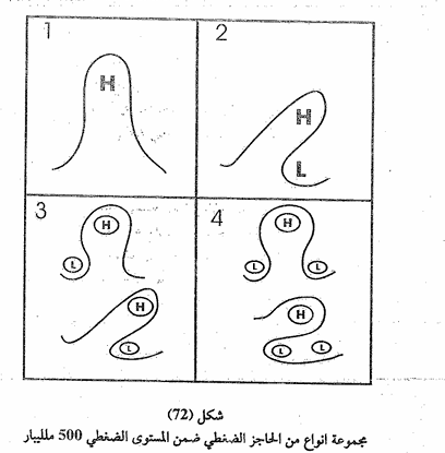 وقدم جيب Geb عام 1966م مجموعة من الانواع المختلفة للحاجز الضغطي ضمن المستوى الضغطي 500 ملليبار وكما موضح في الشكل (72) وعلى الرغم من ان النوع رقم (1) و (2) هما في الاصل انبعاج واخدود الا ان Geb اعتبرهما من اشكال الحاجز الضغطي واتضح من خلال دراسة قام بها بيري (Perry) ان الايام الحارة في بريطانيا والتي تتجاوز درجة حرارتها 032 مئوية تتزامن مع تواجد الانواع (2-3-4) من الحاجز الضغطي، اما النوع رقم (1) فدورة قليل جدا في تكوين الايام الحارة على الجزر البريطانية.