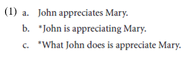 We are concerned with a contrast between the class of event verbs and the class of state verbs, so let us be clear about which verbs we are calling state verbs. Besides the grammatically special have and be, we can list: appear, appreciate, believe, belong, concern, consist, contain, depend, desire, equal, hate, hear, imagine, involve, know, like, love, matter, mean, need, own, owe, perceive, possess, prefer, realize, recognize, remember, resemble, see, seem, smell, taste, tend, think, understand, want, and wish.1 These verbs share a number of syntactic and semantic properties (see Sag 1973, Dowty 1979, and especially Hinrichs 1985 for extensive discussion). To illustrate, we see in (1) that, without additional context, the state verb appreciate is acceptable in simple present tense (1a), but not in the progressive (1b) or the wh-cleft construction (1c).