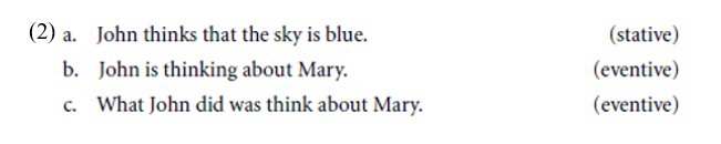 It should be pointed out that a number of the verbs listed above have eventive uses as well as stative uses. This can be illustrated with the verb think: when used in the progressive (as in 2b) or as part of a wh-cleft (as in 2c) it has an eventive reading, while when used in the simple present tense (as in 2a) it has a stative reading.