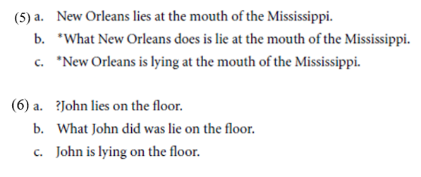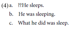 We are also uninterested in the frequently miscategorized verbs sleep, hold, and wait (whichMaienborn 2005 has confusingly termed “state” verbs).While these may seem to share many semantic features with statives, they do not behave grammatically as such, as indicated in (4):
