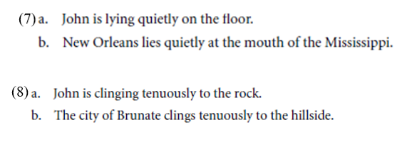 It is not clear whether this indicates ambiguity, or whether the stative interpretations in (7b) and (8b) are some sort of metaphorical extension of the event usage with concomitant metaphorical shift of the adverb meaning (Schafer 2002).