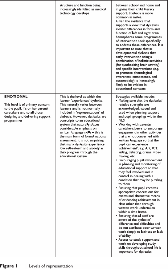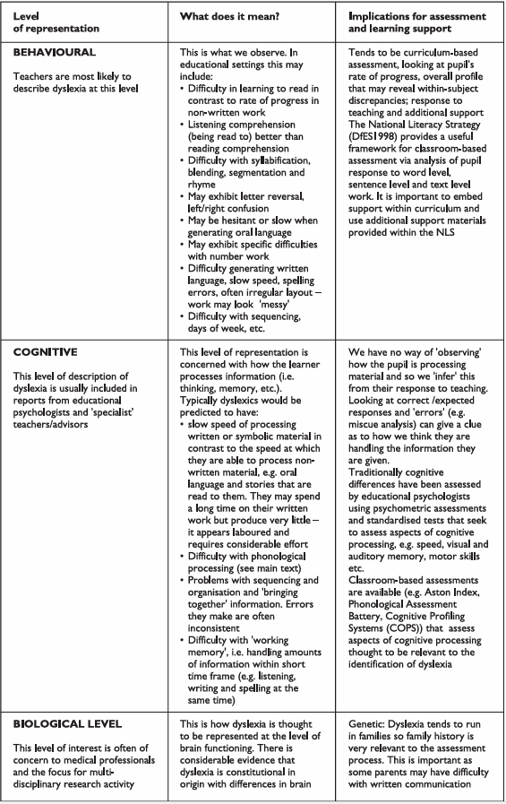 As can be seen from the exemplar definitions, there are some elements of consensus about dyslexia that may help those new to the field to understand learners who experience dyslexia. It is important to understand that dyslexic learners are individuals and although they may share some common features of dyslexia, there are wide individual differences. It may be that one learner only exhibits mild difficulties and can have their learning needs met within the context of the mainstream environment, while another learner with dyslexia may require an Individual Education Plan (IEP) in order to secure provision that is ‘additional to or different from’ that provided for their peers (DfES, 2001b: Section 6:59). In looking at the definitions of dyslexia, it can be seen that dyslexia is represented at different levels. These are consistent with the schema described by Morton and Frith in 1993 and 1995. In order to understand dyslexia, it may be helpful to consider ‘levels’ of representation and how they impact upon assessment and learning support for dyslexic learners (Figure 1).