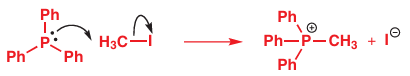 Now the all-important question: which is the nucleophile and which is the electrophile? For the nucleophile we are looking for a high-energy pair of electrons such as a lone pair, which the phosphorus has. Likewise, methyl iodide fi ts the bill as a plausible electrophile, with its bond between C and an electronegative element (I). All that remains is to draw the arrows. The fi rst one starts on the source of the electrons, the phosphorus lone pair, and finishes near the C atom to indicate the new P–C bond. The second one breaks the old C–I bond and moves electrons onto the I atom.