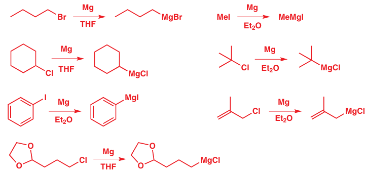 Grignard reagents are made by reacting magnesium turnings with alkyl halides in ether solvents to form solutions of alkyl magnesium halide. Iodides, bromides, and chlorides can be used, as can both aryl and alkyl halides. Our examples include methyl, primary, secondary, and tertiary alkyl halides, aryl and allyl halides. They cannot contain any functional groups that would react with the Grignard reagent once it is formed. The final example has an acetal functional group as an example of one that does not react with the Grignard reagent. (See Chapter 23 for further discussion.)