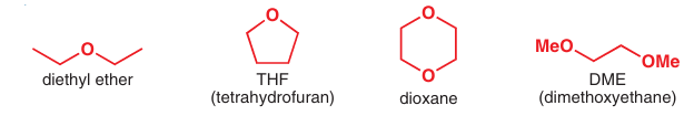 The solvents in these examples are all ethers, either diethyl ether Et2O or THF. Other solvents that are sometimes used include the diethers dioxane and dimethoxymethane (DME).