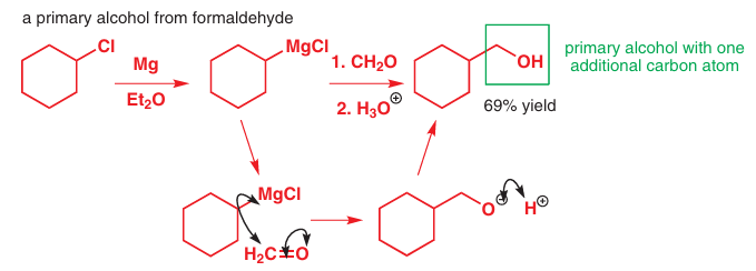 You met formaldehyde, the simplest aldehyde, in Chapter 6, where we discussed the difficulties of using it in anhydrous reactions: it is either hydrated or a polymer paraformaldehyde, (CH2O)n, and in order to get pure, dry formaldehyde it is necessary to heat (‘crack’) the polymer to decompose it. But formaldehyde is a remarkably useful reagent for making primary alcohols, in other words alcohols that have just one carbon substituent on the hydroxy- bearing C atom. Just as carbon dioxide adds one carbon and makes an acid, formaldehyde adds one carbon and makes an alcohol.