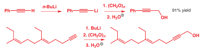 In the next two examples, formaldehyde makes a primary alcohol from two deprotonated alkynes. The second reaction here (for which we have shown organolithium formation, reac tion, and quench simply as a series of three consecutive reagents) forms one of the last steps of the synthesis of Cecropia juvenile hormone, whose structure you met right at the beginning of the chapter.
