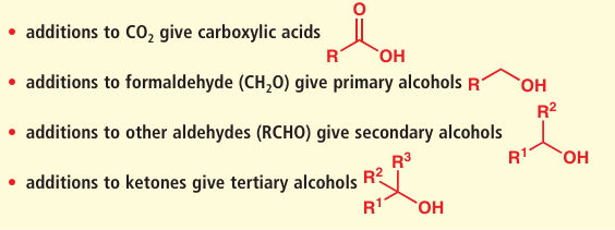 ●Something to bear in mind with all organometallic additions to carbonyl compounds is that the addition takes the oxidation level down one (oxidation levels were described in Chapter 2, p. 33). In other words, if you start with an aldehyde, you end up with an alcohol. More specifically,