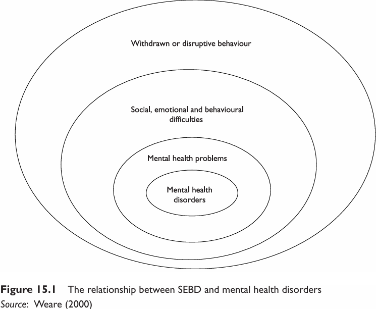In 1994 a Department of Education circular, Pupils with Problems said: ‘schools … play a vital part in promoting the spiritual, cultural, mental and physical development of young people … the emotional development of children must continue to be a concern of mainstream education’. Teachers can identify learners with SEBD, but there is, understandably confusion about the boundaries between ‘normal’ SEBD and mental illness. Figure 1 illustrates the relationship between SEBD, mental health problems and mental health disorders. However, the Special Educational Needs Code of Practice (2001a: 140, 10.27) says: ‘Many children with mental health problems, but by no means all, may also be recognized as children with emotional and behavioral difficulties.’