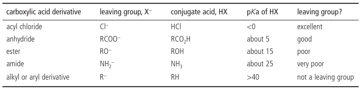 ●Leaving group ability, The lower the pKa of HX, the better the leaving group of X− in carbonyl substitution reactions.