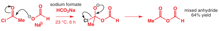 We can use pKa to predict what happens if we react an acyl chloride with a carboxylate salt. We expect the carboxylate salt (here, sodium formate or sodium methanoate, HCO2Na) to act as the nucleophile to form a tetrahedral intermediate, which could collapse in any one of three ways. We can straightaway rule out loss of Me− and we might guess that Cl− is a better leaving group than HCO2 − as HCl is a much stronger acid than a carboxylic acid, and we’d be right. Sodium formate reacts with acetyl chloride to give a mixed anhydride.