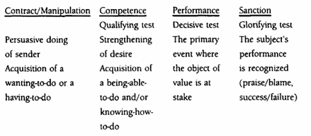 Contract/manipulation: The sender transmits to the receiver the desire or obligation to act. What is known as a contract is established between the two and the subject embarks on a quest. The contract is followed by three tests. These tests mirror the fundamental logic of human action: