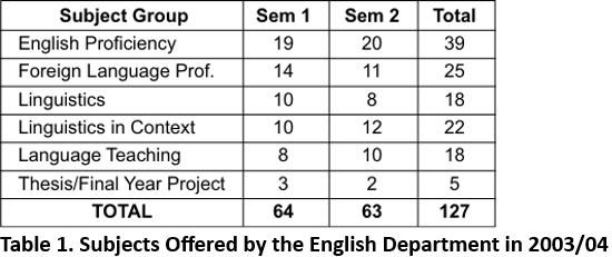 The number of subjects taught by all staff members of the English Department in the academic year 2003/04 is 127. For logistical purposes, the 127 subjects offered by the English Department were divided into six "subject groups" (a list of the content subjects is given in Appendix 2). Table 1 below provides an overview of these groupings.