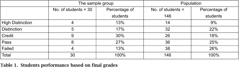 It is worth noting that there was no formal analysis carried out on the impact of the misalignment on the success or failure in the final examination of the two tutorial groups. However, of the 30 students in these two groups, four were awarded High Distinction, five Distinction, nine Credit, eight Pass grades and four Fail grades. The results in Table 1 show the performance of students in the sample group based on final grades compared to the rest of the population. There were nine tutorial groups in total.