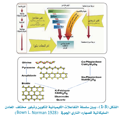 4- سلسلة تفاعلات الكيميائية للعالم بوين BowenChemical Reaction Series عندما تبدأ المعادن في الصهارة النارية السليكاتية فى التبلور، فإن مراحل التبلور لهذه المعادن تتكون فى درجات حرارة مختلفة، ولذلك فإن الاختلاف والتدرج في تبلورها يؤدي إلى التغير في تركيبها الكيميائي وتشكيل أنظمتها البلورية ( المعدنية) المختلفة وقد وضع العالم بوين (Norman L. Bown) نظرية تبلور المعادن السليكاتية من الصهارة النارية الجوفية من خلال التتابعات المستمرة أو المتقطعة للتفاعلات الكيميائية للصهارة بتأثير انخفاض درجة الحرارة ومحتوى السليكا ( SiO ) أثناء صعود الصهارة باتجاه القشرة الأرضية، وتكوين مختلف الصخور النارية الجوفية ومقابلاتها الصخرية السطحية وقد قسمت هذه التتابعات الكيميائية للمعادن الى قسمين أو ذراعين منفصلين: