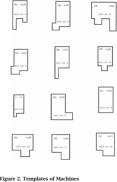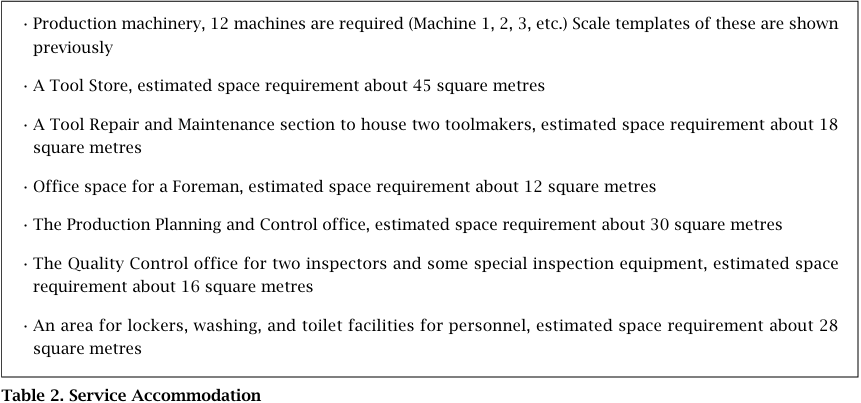 Firstly, a brief introduction to layout planning was given whereby typical objectives of layout planning were explained followed by some elementary layout planning techniques. The purpose of this introduction was to set the scene and provide students with just enough information to be able to recognize, define, and analyze the case without actually explaining to them what to do. They were then divided into groups of about four to five students per group and given the case. This was briefly described to them so as to facilitate a thought-provoking discussion in the class. (see Figure 1 - Layout Plan in possible problems, Figure 2 - Templates of Machines, Table 1 Production Data, and Table 2 - Service Accommodation).