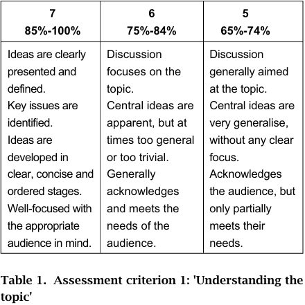 The assessment criteria themselves were developed to be closely aligned with the desired learning outcomes for the unit, with emphasis placed on the level of understanding of the topic and the information context, the quality of the research, analysis and critical reasoning. As each student could select their own specific discussion topic, the assessment criteria were written at a high level to have general applicability across a variety of situations. The weighting of each criterion varied, to indicate to students the value of the different areas of the work they were asked to produce.