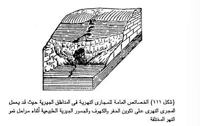 وقد تعمل المياه الجارية السطحية في المناطق الجيرية على حفر مناطق عميقة في الصخور الضعيفة وتؤدي إلى تكوين خنادق وكهوف جيرية تختفى فيها أجزاء من هذه المجاري النهرية. وقد ينتج عن ذلك أيضا تكوين الجسور الطبيعية نتيجة لذوبان الصخور الجيرية بفعل المياه الجوفية وتجدر الاشارة إلى نقطة أخرى وهى أن عمليات الأسر النهرى قد تتكون كذلك في جوف الصخور، ففي بعض الأحيان قد يتمكن نهرسطحي من أن يعمق مجراه خلال التكوينات الجيرية التي تقع بالقرب من مجرى نهرى جوفي . ومن ثم تتحول مياه النهر السطحي وتنحدر صوب مجرى النهر الجوفي عن طريق فتحات الشقوق العريضة والمسالك الجوفية ، ومن بين أظهر الأنهار الجوفية نهر ريكا Reka الذي يمتد بالقرب من مدينة تريست ، ويبلغ طول مجراه الجوفى نحو 18 ميلا .