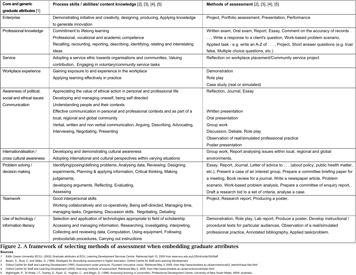 Having outlined some of the concerns about assessment practices experienced by both students and staff at ECU, the paper argues that the processes of embedding the graduate attributes into curricula provides a valuable opportunity to address these concerns in the context of planning the teaching, learning and assessment strategy within courses/units. A set of guiding principles based on a review of relevant literature on learning and assessment and a graduate attributes-assessment methods grid is presented.