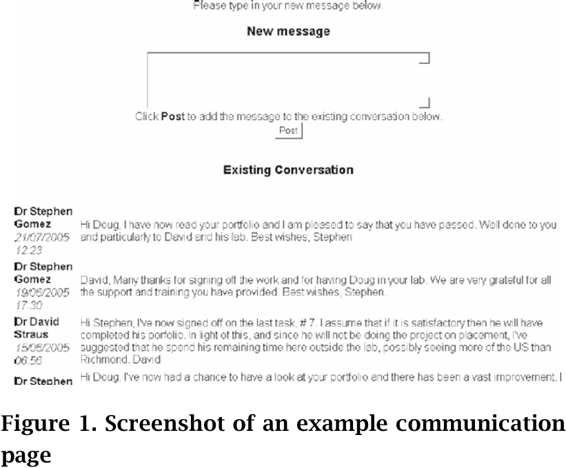 Messages can be written in the top field by the student, work supervisor and tutor and when the "Post" button is clicked, the message appears in the table with details of who wrote the message and the date it was posted. The messages are stored and serve as an aide memoir for earlier dialogue and as an automatically-managed audit trail. Whenever a message is posted, automated email messages are sent to the stakeholders involved to alert them to the waiting message. In the automated email, a hyperlink is provided which, if selected, automatically logs them in to view and reply the message. This link is single use only for security reasons.