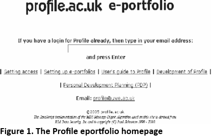 The homepage (Figure 1) has a simple design as it serves principally as the login page to the e-portfolios. A few links take visitors to explanatory web-pages. The website is constantly undergoing development and the screenshot below is current as of publication.