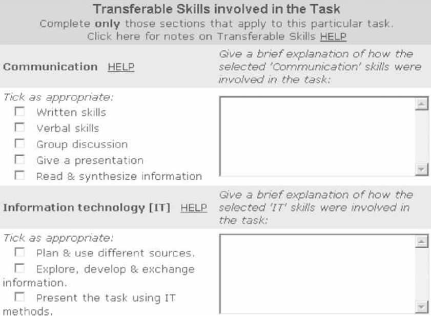 There is much discussion concerning the integration of key skills within HE programs (Fallow & Steven, 2000). Making students aware of the transferable skills they use on placement is important as previously these were neither recognized nor valued. This section on the task description web-form provides an extensive table of transferable skills. Only two skills are shown in the screenshot below but the full list includes: