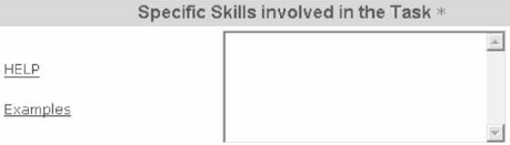 The next topic allows the student to document the specific skills required for the task. If the student is involved in a particular laboratory procedure, those skills specific to carrying out that procedure can be mentioned. Again, examples and help are provided through hyperlinks to support web-pages.