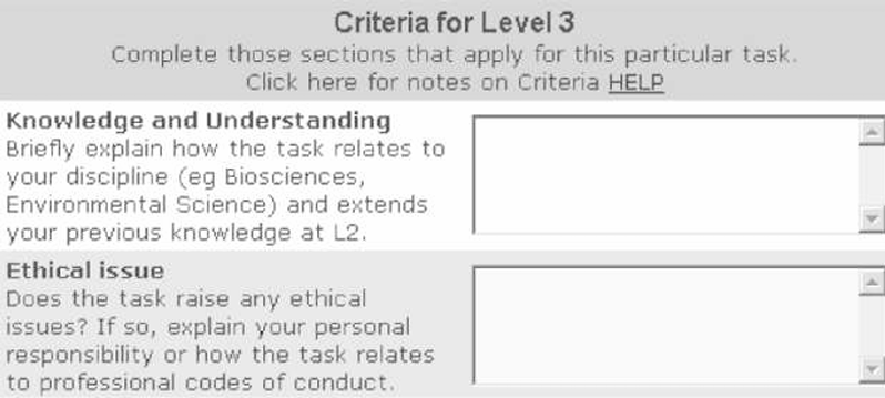The portfolio forms part of the assessment for awarding academic credit at L3. The students, therefore, are required to justify individual tasks at this level. They are assisted in this by the "Criteria for Level 3" section on the web-form. Seven areas are covered (2003):