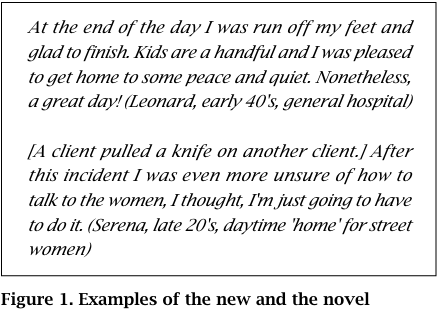 There were qualitative differences related to being in the placement that were seen as likely to have an impact on the learning. The first area of difference was related to whether or not the experiences were 'new' or 'novel'. This is a distinction that exists in German, and not in English, but which is helpful here, in that 'new' experiences are those which have some similarity to previous experiences and 'novel' experiences are totally foreign to everything one has encountered before. Novel circumstances, it appears from this study, will raise the question of appropriate action more starkly than the new (Figure 1).
