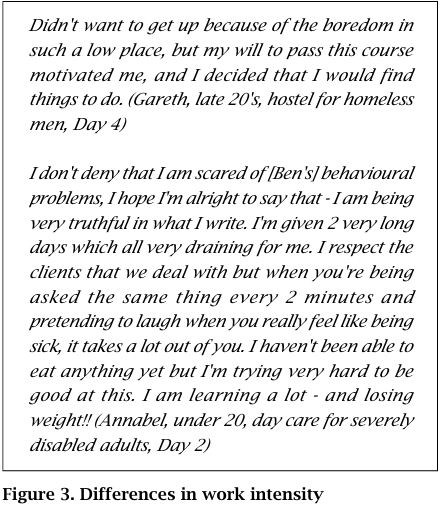 The intensity of the work was the third area of variation: some students had little to do, and were even encouraged by staff in the placement to undertake their reading in work-time, while others rushed from one job to another in 12 hour shifts, sometimes with a heavy emotional load (Figure 3).